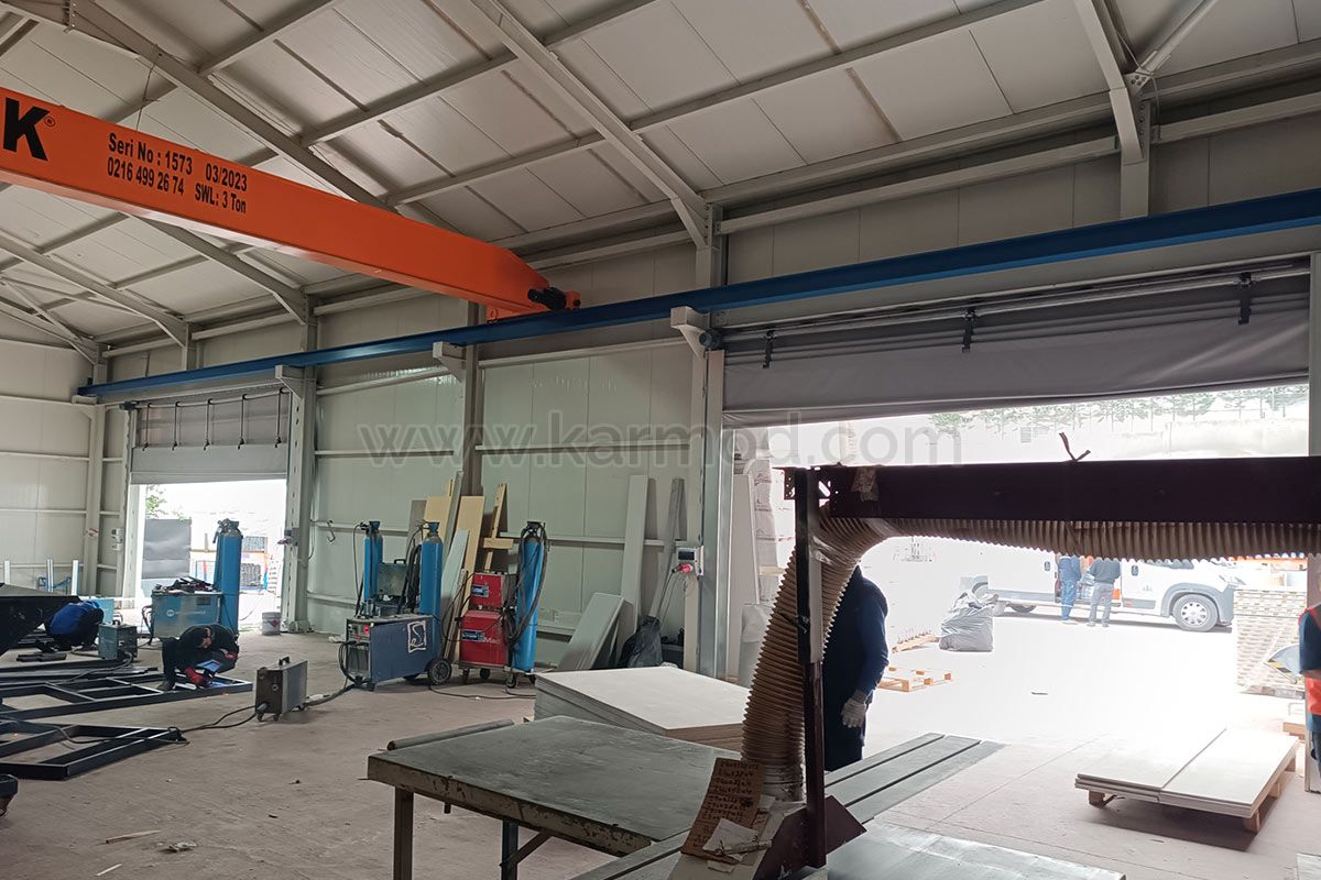 Hangarda 10 m açıklığın verdiği avantajla tavan vinci 25 m uzunluk boyunca kolaylıkla hareket ettirilebiliyor. Biri dar cephede iki adeti uzun cephede olmak üzere hangarın üç ayrı giriş kapısı bulunuyor. Kapılarda motorlu tente sistemi tercih edilerek kış iklimlendirmesi kolaylaştırıldı.