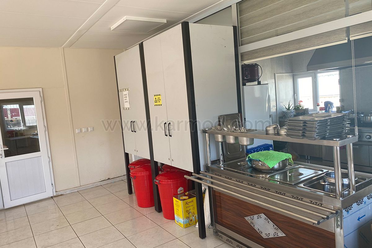 İlamet Metal için Karmod tarafından inşa edilerek hazırlanan yapılardan biri de yemekhane binası. Prefabrik yapı sistemiyle üretilip inşa edilen yemekhane binası tek katlı ve 246 m2 büyüklüğe sahip. Yemekhane binasında aynı anda 123 kişi yemek yiyebiliyor. Binada yemek hizmeti catering firması tarafından sağlanıyor. Arka kısımda hazır yemek sunumu için tabak gibi ekipmanların yer aldığı bir bölüm yer alıyor. Bu kısımda bulaşık makineleri de konumlandırılmış durumda. Farklı girişten yemek salonuna giren fabrika çalışanları yan bölümde yer alan bankodan yemeklerini alıyor. Prefabrik yemekhanede yemek saati leziz yemekler tadılırken aynı anda hoş sohbet anına dönüşüyor.