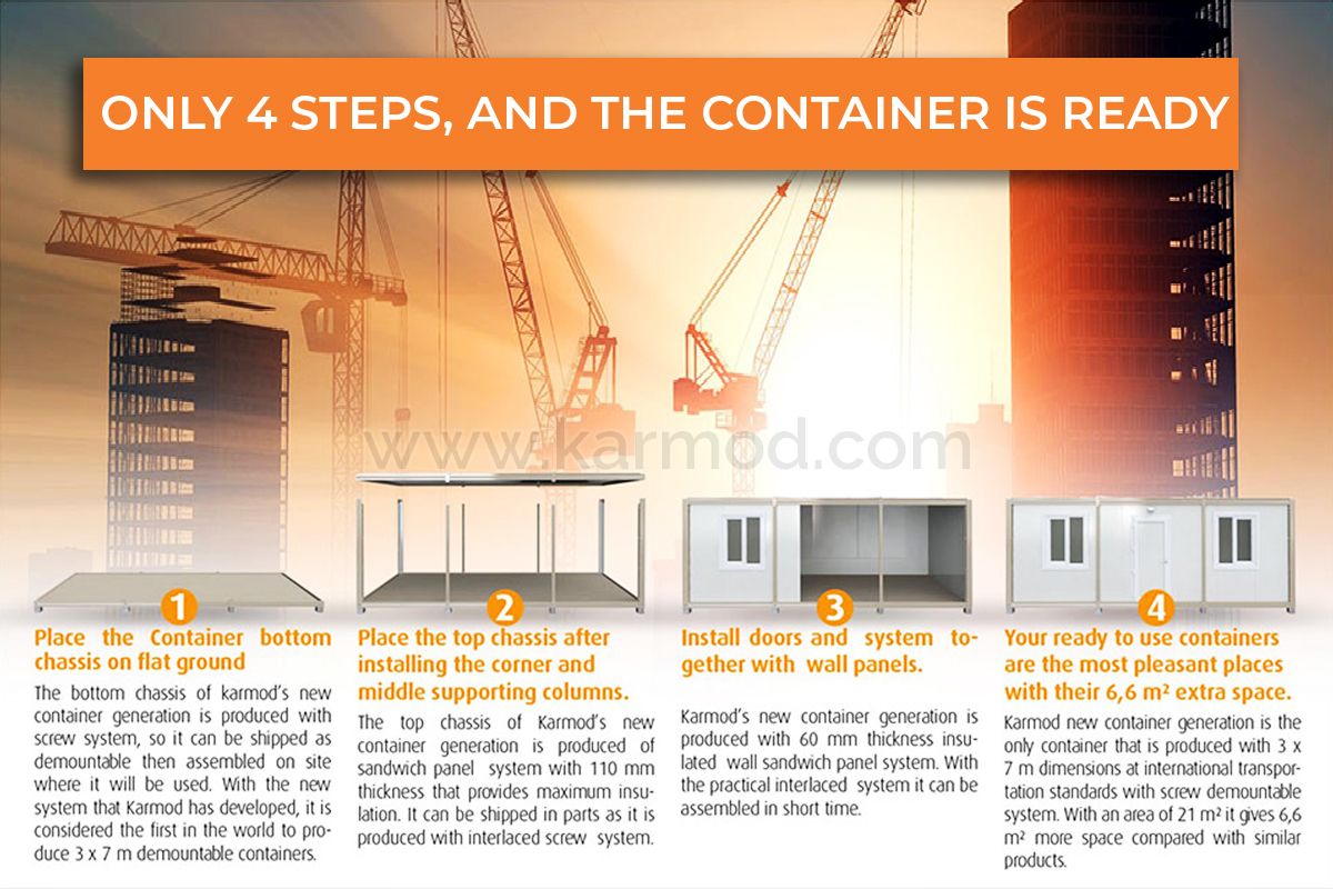Стенные СИП панели, а также используемые первый раз в Турции 125 миллиметровые кровельные панели обеспечивают высокий уровень тепло и звукоизоляции. По сравнению с аналогами наши контейнеры обладают более высокими изоляционными качествами, что позволяет им сберегать до 60 % энергии. Контейнеры нового поколения Кармод помогают вам экономить.