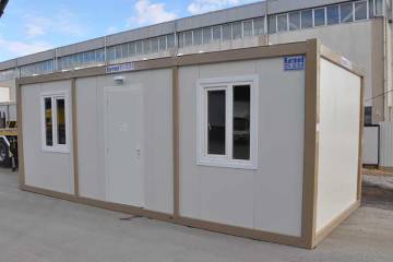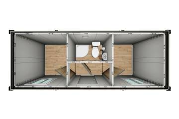 Настоящая модель контейнера полной заводской готовности состоит из двух комнат по 4,4 м² и прихожей с санузлом (душевая + унитаз + писсуар). Наши вагончики и бытовки состоят из легко комбинируемых и заменяемых стеновых элементов, с двух сторон обшитых оцинкованным листом стали. Это универсальная альтернатива обычным строениям за намного меньшую цену: организационные центры, офисные здания, жилые помещения, вахтовые и модульные городки, филиалы компаний, строительные площадки, прорабские, вагончик для дачи и другое. Благодаря автоматизированному производству контейнеров, купить вагончик или купить бытовку стоит очень дешево.
