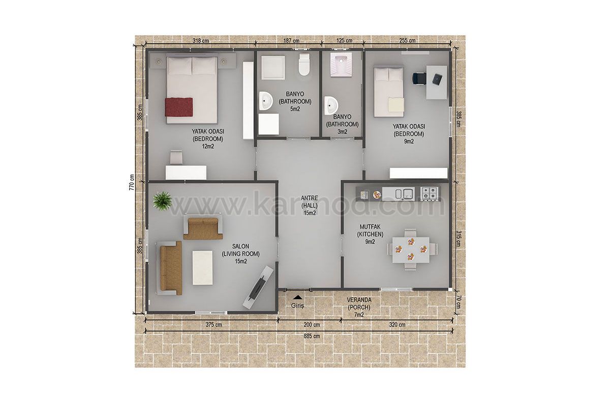 Мы создавали этот креативный дизайн, беря вдохновение от великолепия образчика Османской архитектуры 18 века, дворца Исхакпаша (Исхакпаша Сарайи), на возвышенности Хаким, что в местечке Догубеязыт. Приоритетом модели Исхакпаша из 3 комнат, площадью 75 м2, является бодрящая, активная атмосфера. Терраса впереди каркасного дома, предоставляет возможность наслаждаться видами. Готовые дома из сендвич панелей Кармод отличный вариант для как для городского жилья, так и для загородного, дачного дома для отдыха.
