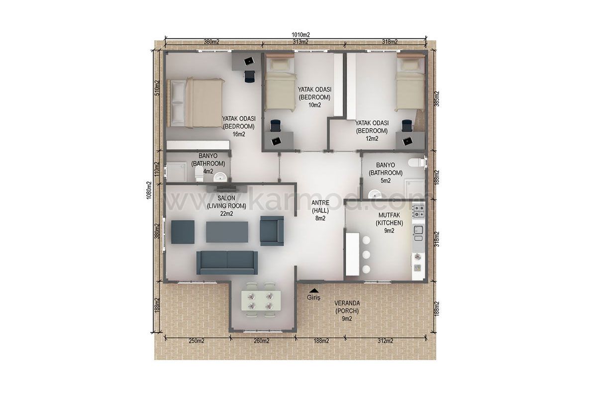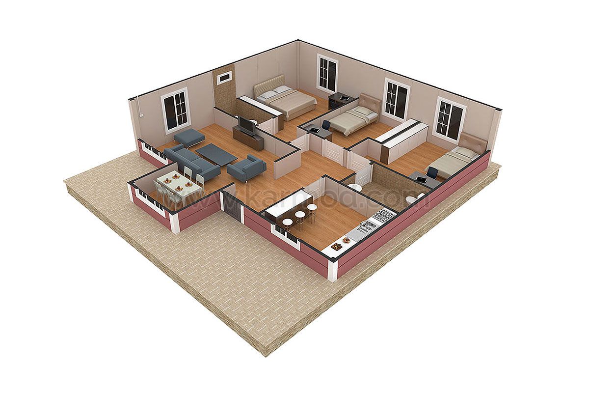 Особенность модели Кучуксу в ее незаурядной изысканной архитектуре для обладателей утонченного вкуса. Это потому, что истоки свои он берет от несравненного образчика Османской архитектуры особняка Кучуксу, расположенного между двух речек Босфора, Кучуксу и Гоксу. После входа с симпатичной веранды, мы попадаем в холл, слева от которого салон, а прямо напротив него, справа - кухня. Затем в задней части дома подряд друг за другом идут три спальни. Эта модель для тех, кто ищет одноэтажный, но просторный готовый дом. Выступ гостиной же подчеркивает своеобразный стиль Кармода. Начиная от проектирования быстровозводимого дома, мы оказываем полное сопровождение процесса, поэтому вы можете купить готовый дом под ключ.