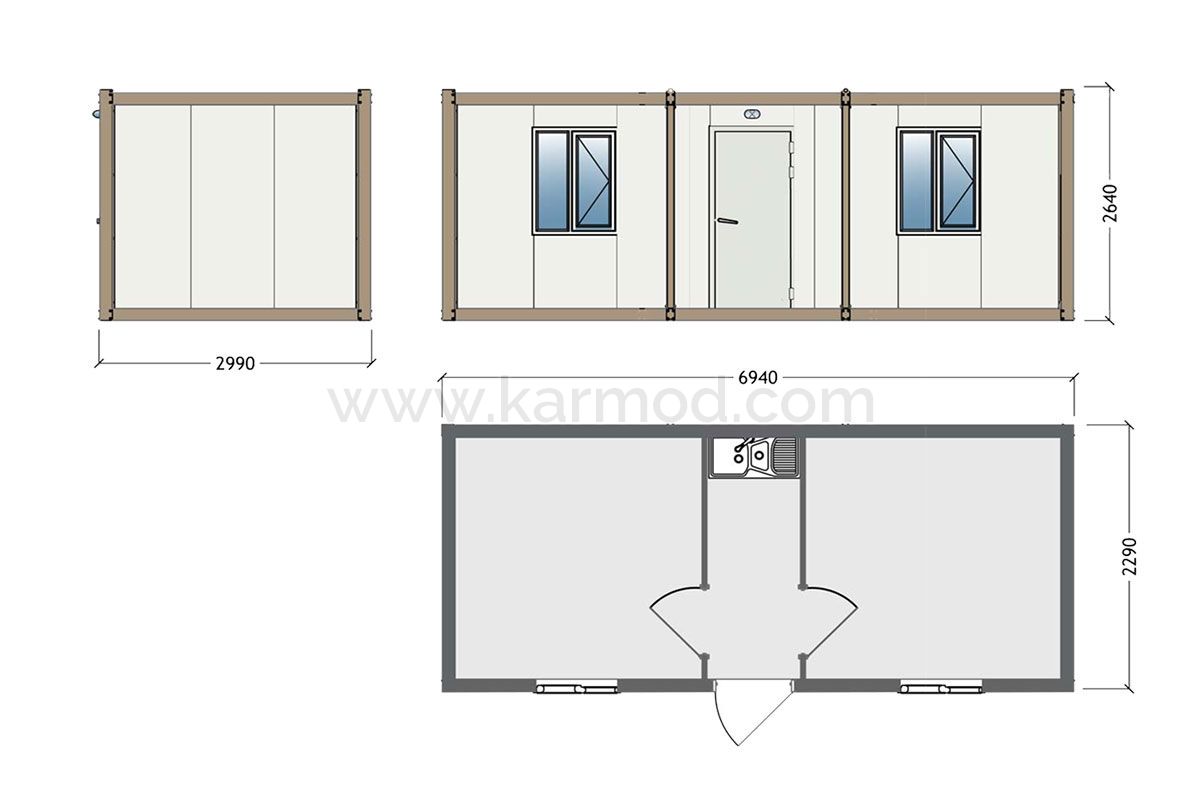 Данная модель мобильного контейнера с размерами 3х7 состоит из двух комнат 7,5 м2 с окном в каждой, и прихожей 2,75 м2 в которой разместилась кухонная мойка. Из таких блок контейнеров можно создавать блочно-модульные сооружения разной конфигурации: рабочие общежития, модульные городки, строительные вагончики бытовки, временное жилье для беженцев и переселенцев. Контейнер собирается из сборных сендвич панелей и металлического каркаса, части которого соединены болтами. Поэтому он может многократно собираться и разбираться, а поврежденные элементы легко заменяются.