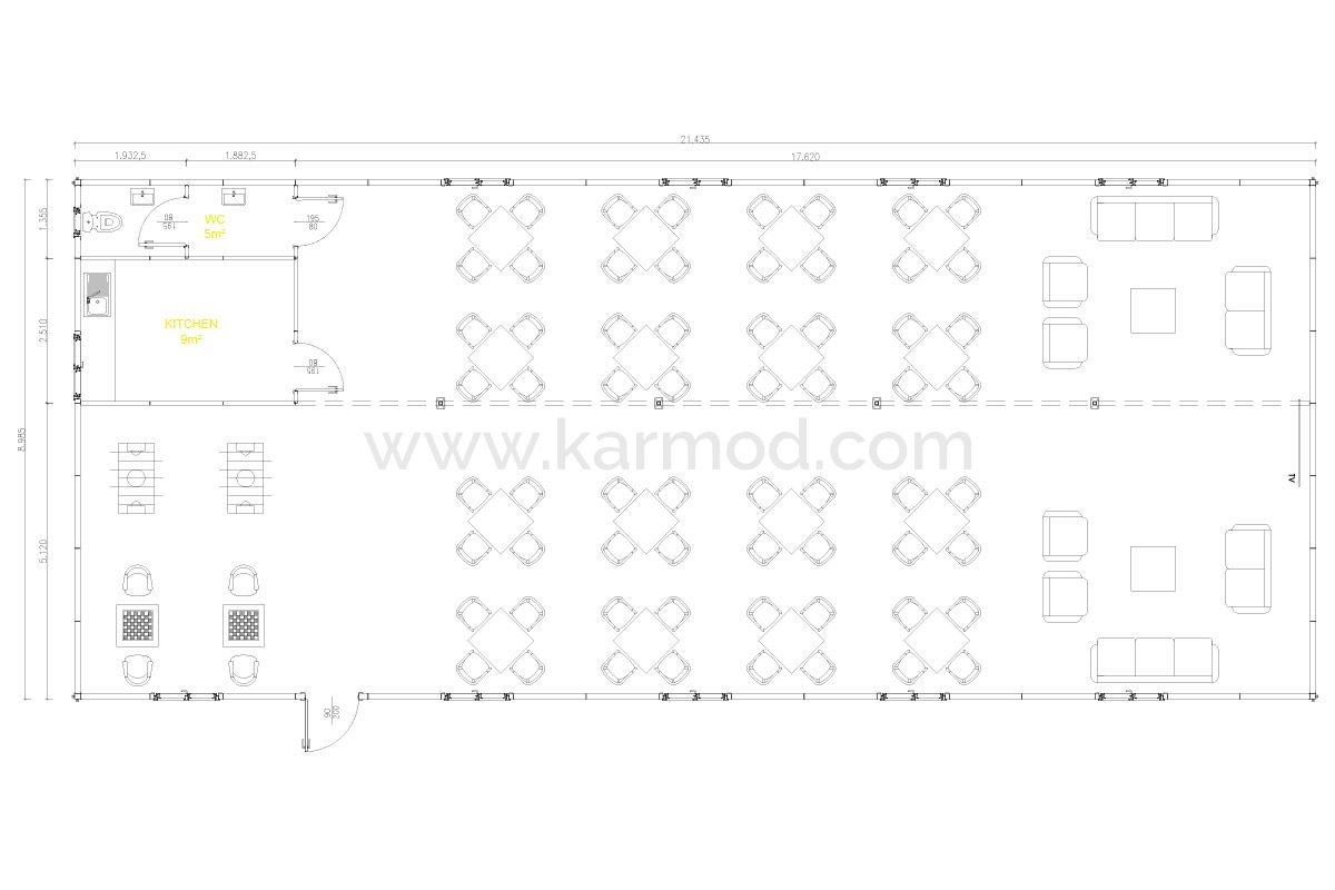 Малый Отдыховый Блок от Кармод площадью 88 м² предлагает идеальное пространство для рекреации для любого сообщества благодаря своему просторному размещению и гибкому дизайну. Этот модульный рекреационный блок, оснащенный высококачественными материалами и дружелюбным к пользователю дизайном, обеспечивает удобную и приятную среду для отдыха. Как самый предпочтительный бренд, Кармод усиливает качество и имидж ваших рекреационных проектов. Это префабрикованное решение предлагает отличную стартовую точку для удовлетворения потребностей сообществ в отдыхе и развлечениях, превосходя ожидания с гибкими возможностями использования.