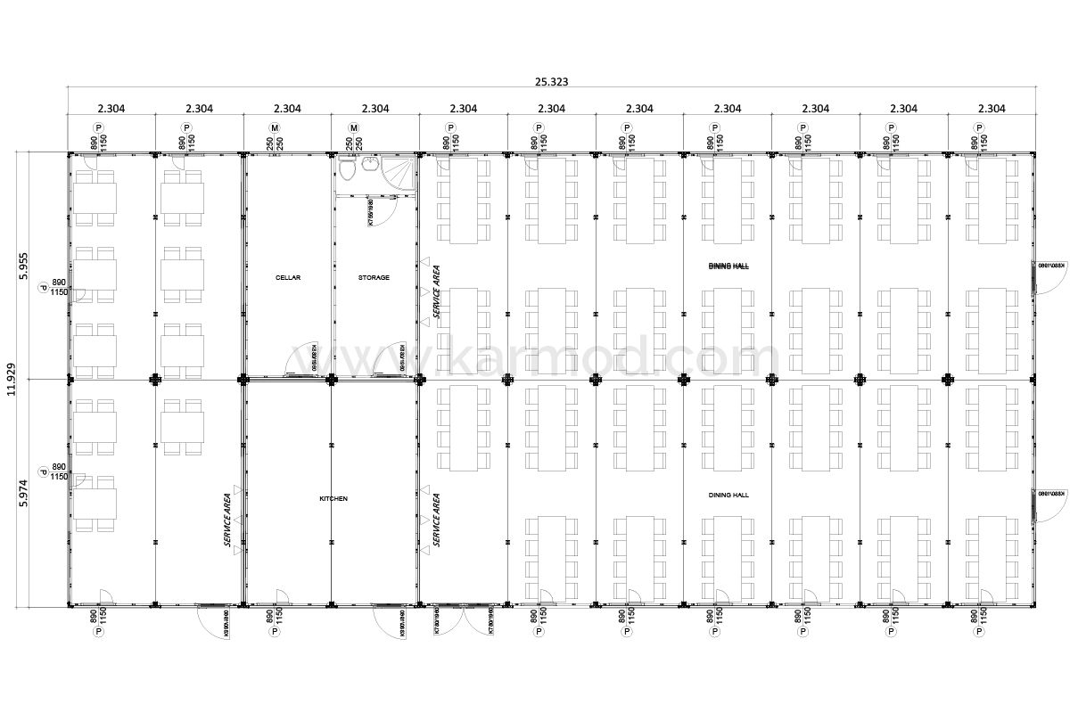 A Karmod continua a oferecer soluções ideais para projetos de grande escala. O Refeitório Container de 302 m², com capacidade para 252 pessoas, apresenta uma solução completa de refeitório para grandes empresas, escolas e canteiros de obra. Este contêiner cafeteria é portátil, prático e útil, destacando-se não só pelo preço acessível mas também pelas suas excelentes características de isolamento. Estas características garantem o conforto interno em qualquer condição climática. A solução de refeitório de grande escala da Karmod combina qualidade e facilidade de uso a um custo acessível.