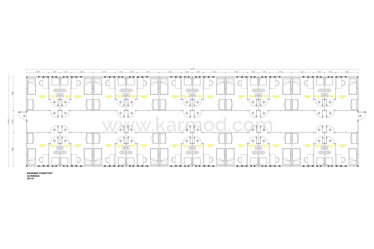 Кармод устанавливает новые стандарты в секторе с его 20-местным общежитием для инженеров. На площади 387 м² наше общежитие, построенное с использованием модульного и инновационного подхода к дизайну, предлагает идеальное решение для долгосрочного проживания инженеров и сотрудников с белыми воротничками. Установка и при необходимости расширение этого общежития упрощены благодаря его модульной конструкции, что делает его идеальным для динамичных и меняющихся проектов. Кроме того, общежитие Кармод решает одну из самых значительных проблем компаний - обеспечение качественного размещения - экономично, эффективно и гибко. Откройте ключ к устойчивому успеху в бизнесе с качеством от Кармод.