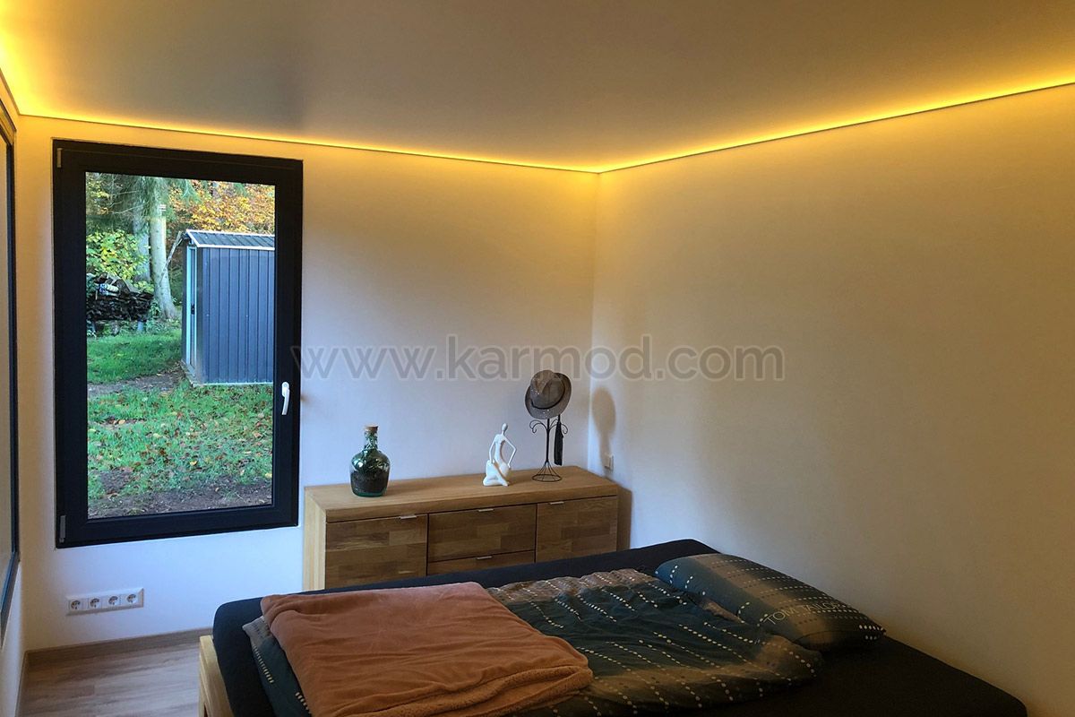 Контейнер Кармод нового поколения стал хорошим примером концепции дома на природе. Строительство дома в основном началось с производства двух отдельных блоков-контейнеров. В рамках проекта были изготовлены две отдельные контейнерные единицы, одна размером 3x7 и другая 3x5 метров. Части, которые были размещены рядом в поле, были размещены в L-плане. В то время как появился симпатичный дом размером 36 квадратных метров, приложения, которые отличали этот контейнер, были реализованы после этого этапа. В качестве стандарта на стенах здания использовалась высокоизолированная система сэндвич-панелей толщиной 5 см. Контейнерному дому был придан естественный вид благодаря гипсокартону изнутри и деревянному покрытию снаружи. Внутренняя часть после нанесения плиты была оштукатурена и окрашена в цвет по желанию заказчика. С внешней отделкой из дерева конструкция возвышается далеко за пределы стандартного дома. Дом, построенный в районе, близком к швейцарским Альпам, приобрел вид, полностью совместимый с концепцией природы в зелени.
