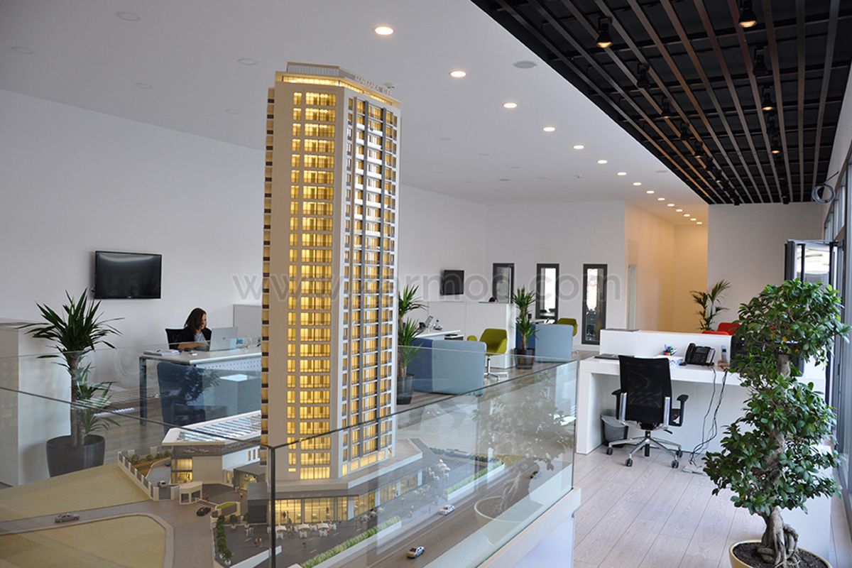 Офис продаж и продвижения был размещен на территории проекта, выходящей на боковую дорогу E-5 (D-100). Перед офисом была оставлена площадка, где клиенты могут легко припарковаться. Вход в офис осуществлялся через стеклянную дверь, которая автоматически открывалась вправо и влево со стороны дороги. При входе через дверь в центре клиентов встречал очень роскошный офис продаж и продвижения. Здесь посетителей встречали три разных торговых представителя. В передней левой части зала была выставлена большая модель проекта башни «Мармара». Благодаря этому макету презентация проекта стала совсем простой. Кухня располагалась с правой стороны в соответствии с направлением входа. Сзади кухни находились мужской и женский туалеты. В то же время из этой зоны был сделан переход в кабинеты руководителей в задней части офиса. Руководитель проекта и начальник строительного участка управляли этапами строительства и продажами башни «Мармара» в своих личных комнатах в этой зоне. Одна из секций в этой зоне также была зарезервирована под переговорную комнату.