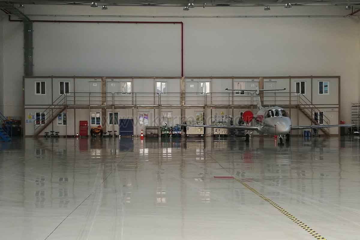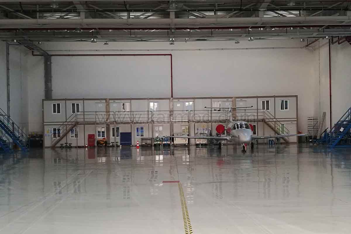 Во время первого создания нижний этаж здания использовался как технический отдел, а верхний - как офис руководства. Поскольку в последующий период парк воздушных судов компании, таких как самолеты и вертолеты, увеличился, возникла необходимость в расширении существующего офиса. Модульная конструкция контейнера нового поколения позволила легко построить необходимые офисные помещения. Имеющаяся высота подъема в зоне ангара стала дополнительным преимуществом при подготовке нового офисного этажа. Проект третьего этажа был подготовлен с сохранением верности существующему фундаменту площадью 84 м2. Аппараты, производство которых было завершено на предприятиях Karmod в течение короткого периода времени - недели, были отправлены в ангар, расположенный в аэропорту Сабиха Гекчен. Монтаж дополнительного пола площадью 84 м2 был завершен всего за 3 дня специалистами компании Karmod. Офис управления, который находился на втором этаже в предыдущем офисе, был перенесен на третий этаж с добавлением нового этажа. Второй этаж был отдан под технический офис. Благодаря надстройке верхнего этажа удалось сэкономить пространство без потери площади. На первом этаже ангарного офисного здания АО Авиация Общего Назначения находится кафетерий, а также технические рабочие помещения.