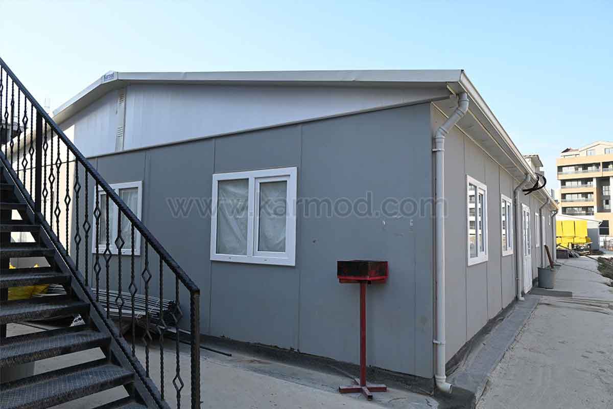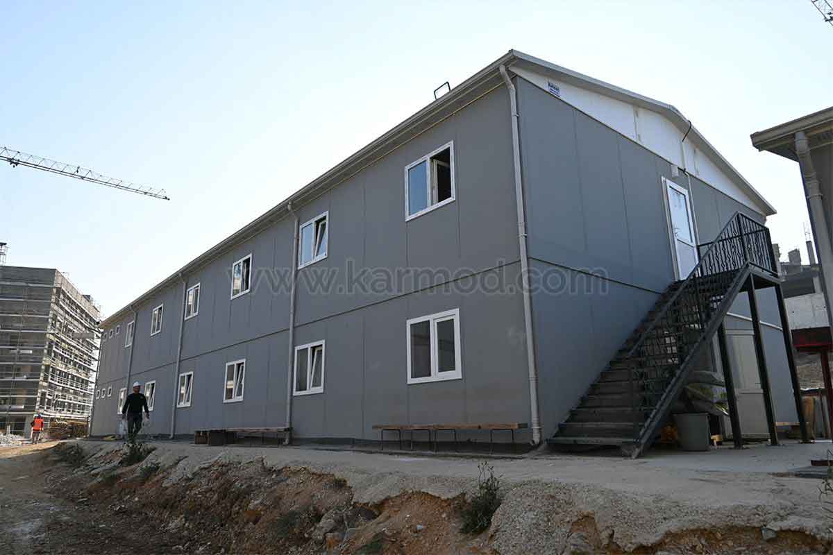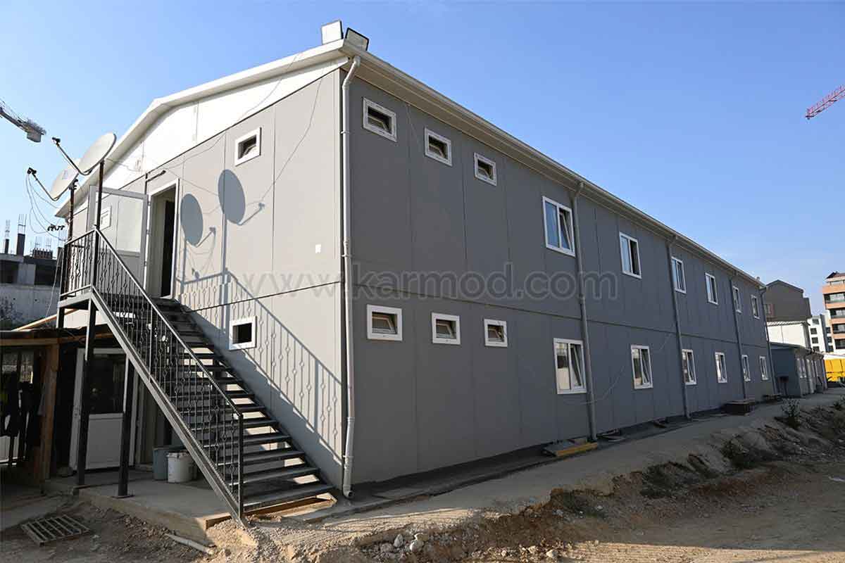 Здание общежития Nextopia Балкан было спроектировано как двухэтажное здание. Оно отражает комфорт сборного здания Karmod вплоть до комнат на каждом этаже. Главная особенность сборных зданий Karmod на строительной площадке заключается в том, что они обеспечивают комфорт дома для всех, кто в них проживает. В двухэтажное здание общежития можно попасть с двух входов. Основная причина этого - обеспечение наилучшей эргономики здания общежития в условиях интенсивного использования строительной площадки. Вход осуществляется через эти двери, выходящие в коридор. Номера расположены слева и справа вдоль коридора. Всего в общежитии 12 комнат на каждом этаже и 24 комнаты на двух этажах. В сборном здании общежития одновременно могут проживать 96 человек. План также предусматривает три душевые и три туалетные кабины на каждом этаже. Проект здания общежития, особенно оборудование в комнатах, был подготовлен в соответствии с международными стандартами охраны труда и техники безопасности.
