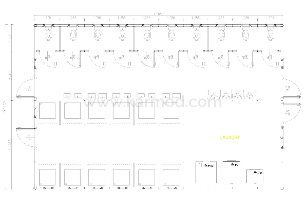 Модульный Туалет с Душем и Прачечной от Кармод, занимающий площадь 106 кв. метров, предлагает идеальное решение особенно для густонаселенных жилых комплексов, рабочих мест и учебных кампусов. С интегрированной прачечной эта единица предоставляет пользователям не только чистоту и гигиену, но и практичное жилое пространство. Это доступное модульное решение, в сочетании с высококачественными материалами и технологией изоляции Кармод, предлагает пользователям экономичную, эффективную и комфортную среду.