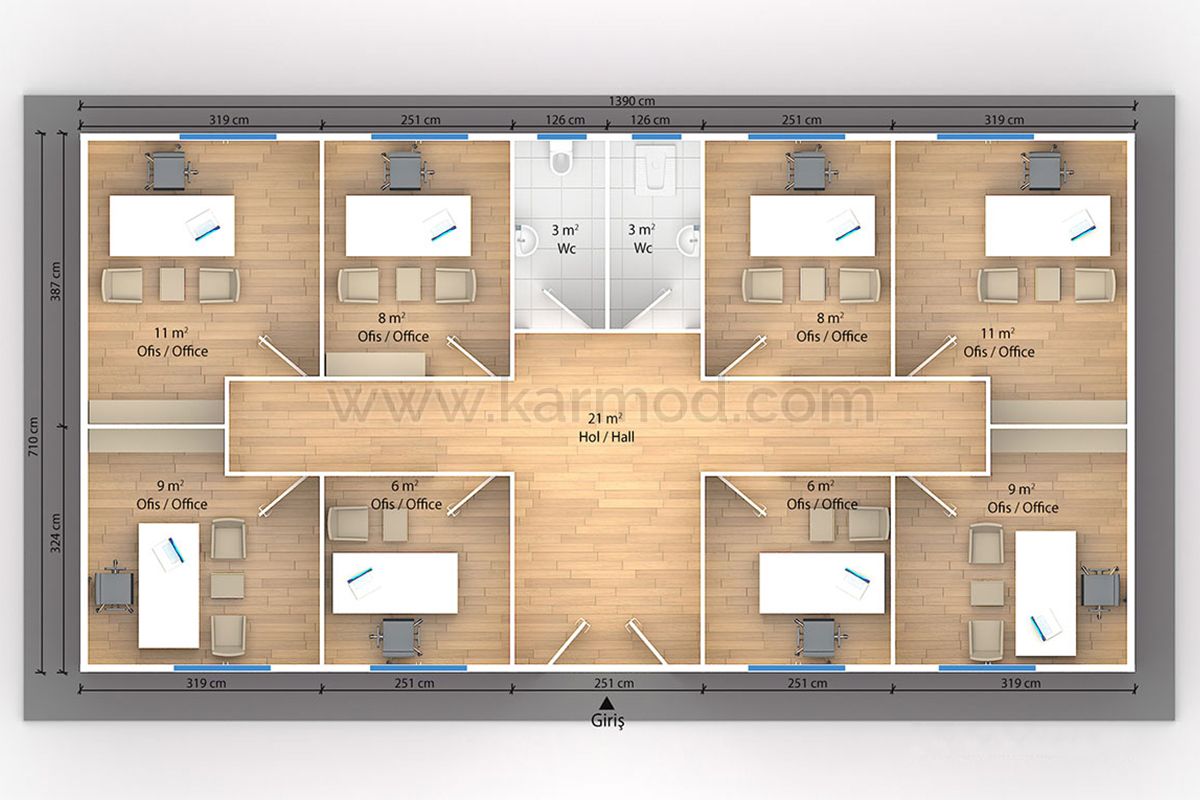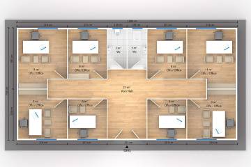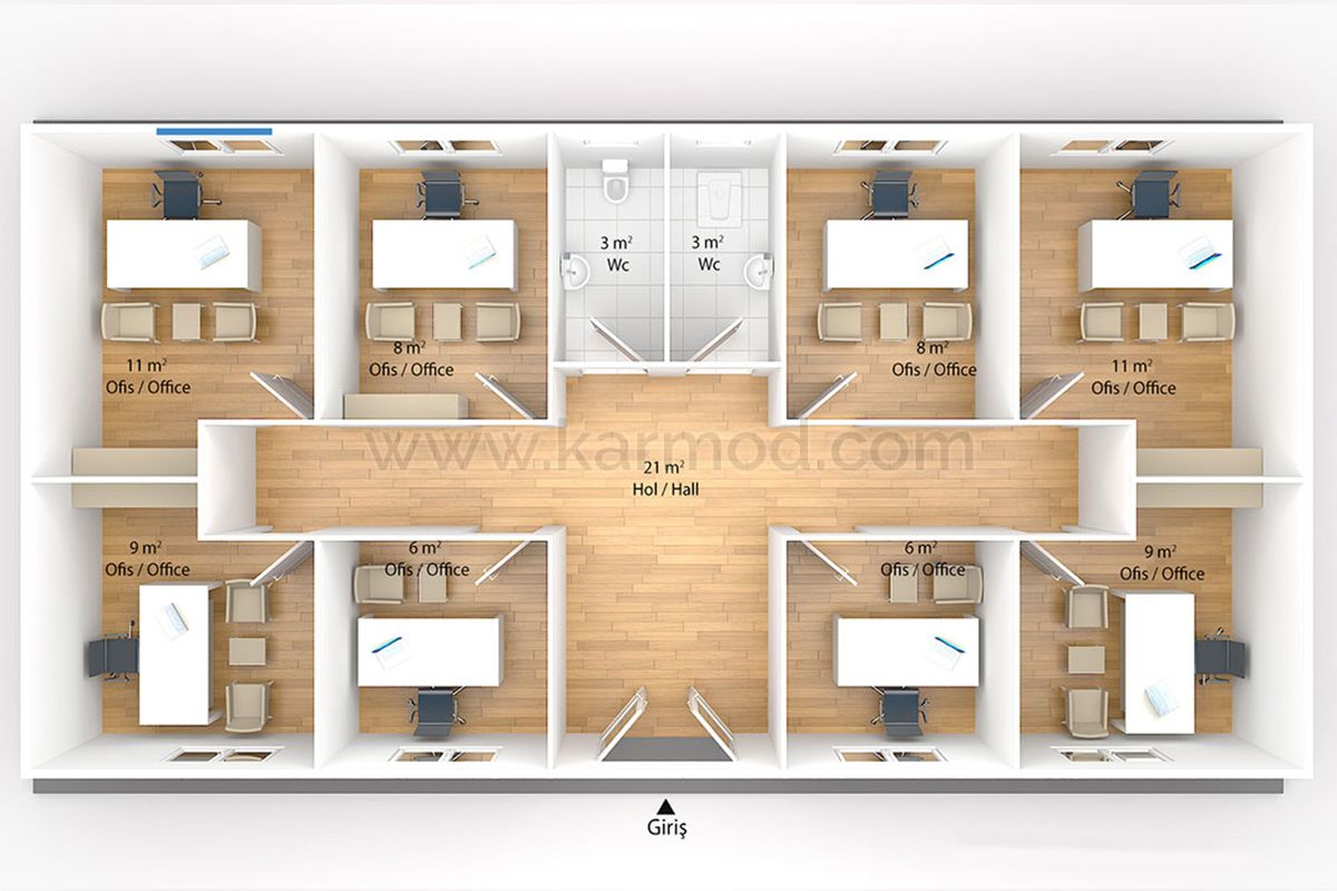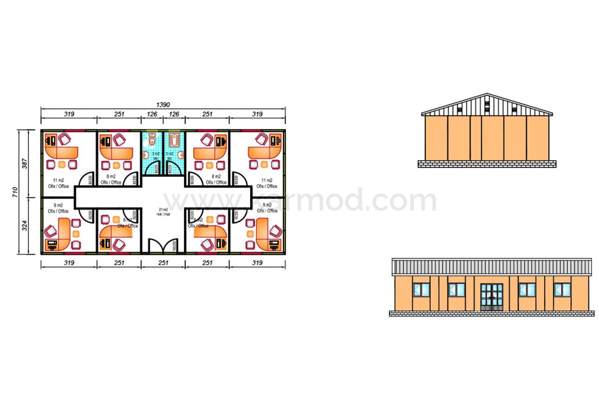 Швидкомонтовані будівлі можуть мати будь-які необхідні розміри і планування. Особливо користуються попитом готові проекти, спеціально розроблені нашими інженерами для максимальної зручності та ергономіки. Залежно від площі, є велика кількість різноманітних типових планувань, починаючи від варіантів 1 + 1 і закінчуючи 3 + 1. Компанія Кармод може виробляти збірні елементи під будь-які проекти готових швидкомонтованих будівель.