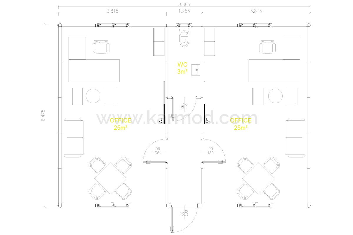 Двомісний Префабрикований Офіс від Кармод забезпечує відповідність сучасним очікуванням бізнесу завдяки стильному дизайну та комфортному робочому середовищу. Модульний офіс площею 58 м² поєднує естетику та функціональність, підвищуючи мотивацію та продуктивність працівників. Обладнаний високоякісними матеріалами та сучасним інтер'єром, префабрикований офіс Кармод створює здоровий та спокійний робочий простір. Як один із найбільш обраних брендів, Кармод пропонує бізнесам та професіоналам швидке, економічне та налаштоване на потреби рішення для офісу, стаючи ідеальним стартовим пунктом для розвитку та зростання вашого підприємства.
