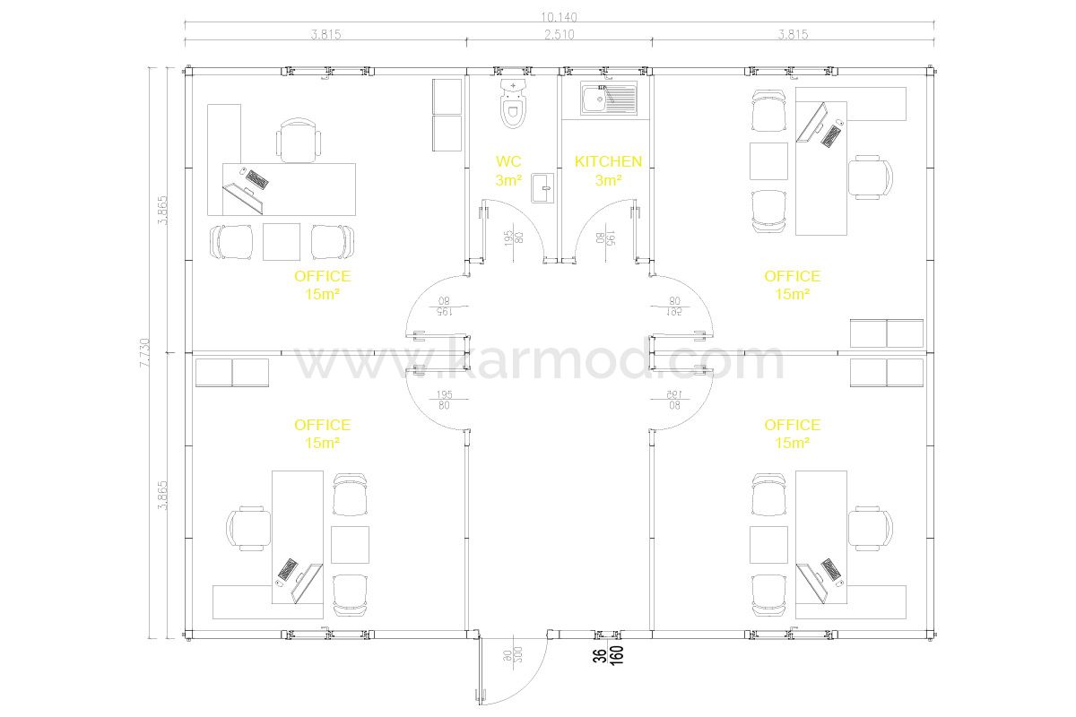 Чотириосібний Префабрикований Офіс від Кармод площею 78 м² забезпечує миттєве рішення для ваших нагальних потреб у офісі завдяки швидким процесам виробництва та монтажу. Розроблений із урахуванням швидко змінних вимог сучасного бізнесу, цей модульний офіс може бути швидко введений в експлуатацію. Відомий як надійна компанія з референціями у 135 країнах, Кармод займає лідируюче місце на глобальному ринку. Цей префабрикований офіс ідеально підходить для швидкого розширення вашого бізнесу або задоволення потреб у мобільному офісі.