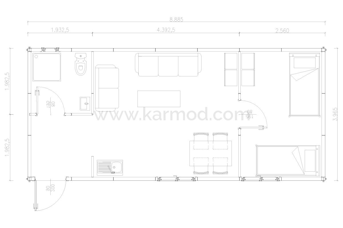 Кармод із своїм Двокімнатним Будинком для Сімей Біженців не лише пропонує швидке та економічне рішення для проживання, але й забезпечує комфортабельний та безпечний житловий простір. Цей префабрикований будинок площею 35 м² розроблено, враховуючи потреби в приватності та комфорті сімей біженців та осіб, що потребують тим