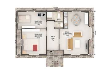 Витончена лоджія прибудована до просторої залі цього будинку площею 71 м2, надасть вам естетичну атмосферу домашнього затишку. Ця модель може бути зведена за такий короткий термін, як три дні. Всі роботи по установці стін, дверей, вікон, покрівлі, покриття покрівлі, електропостачання, сантехнічного обладнання проводять фахівці Кармод. Вам тільки залишається замовити будинок з гарантією Кармод і насолоджуватися.