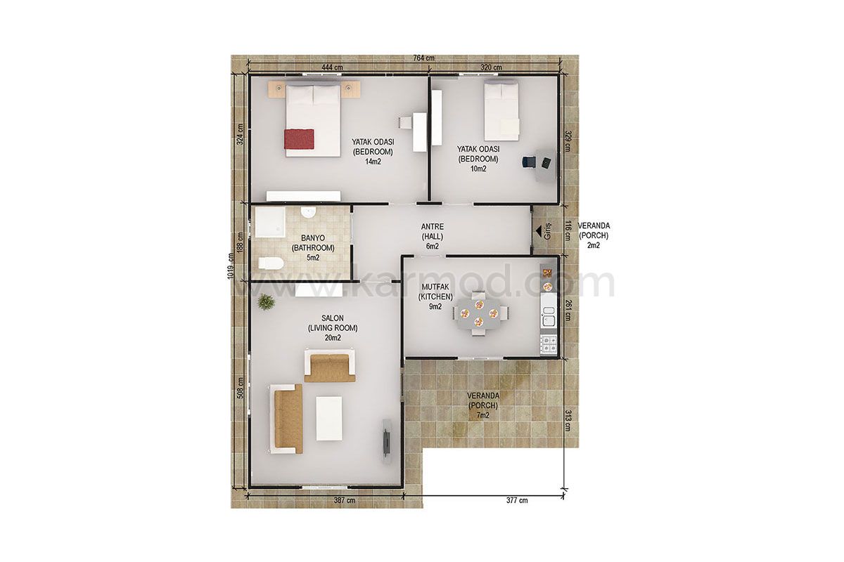 Завдяки L-образному плануванню і просторої веранді, на якої ви зможете насолоджуватися оглядом безкрайніх просторів, варіант Айсофія з модельного ряду збірно щитових будинків Кармод, це перший вибір тих, хто шукає затишок і комфорт. Як і у всіх інших модульних будинках, дизайн цього 3-кімнатного планування, був спеціально розроблений архітекторами і інженерами Кармод для функціонального, комфортабельного середовища.