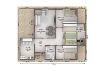 Особняк Аязага, площею 88 м2 що складається з 3 кімнат і одного салону це вибір тих, хто шукає великий широкий простір. З вхідного коридору наліво можна відразу потрапити в часто використовувану господинями кухню, а прямо - в часто використовуваний господарем салон. Крім того в салон є окремий самостійний вхід з веранди. Планування зроблено так, що кухня розташована у вигляді окремого своєрідного виступу. Кожен зможе купити цей збірний будинок.