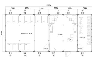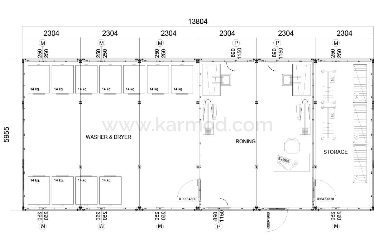 Кармод задовольняє практичні потреби працівників на будівельних майданчиках, пропонуючи спеціально розроблений 82 м² Пральний Контейнер. Його просторий внутрішній об'єм надає достатньо місця для кількох пральних та сушильних машин, а також зони для складання та прасування. Високі ізоляційні характеристики забезпечують енергоефективність та створюють ідеальне середовище для використання цілий рік. Це доступне та якісне рішення сприяє комфортному життю працівників на будівельних майданчиках.