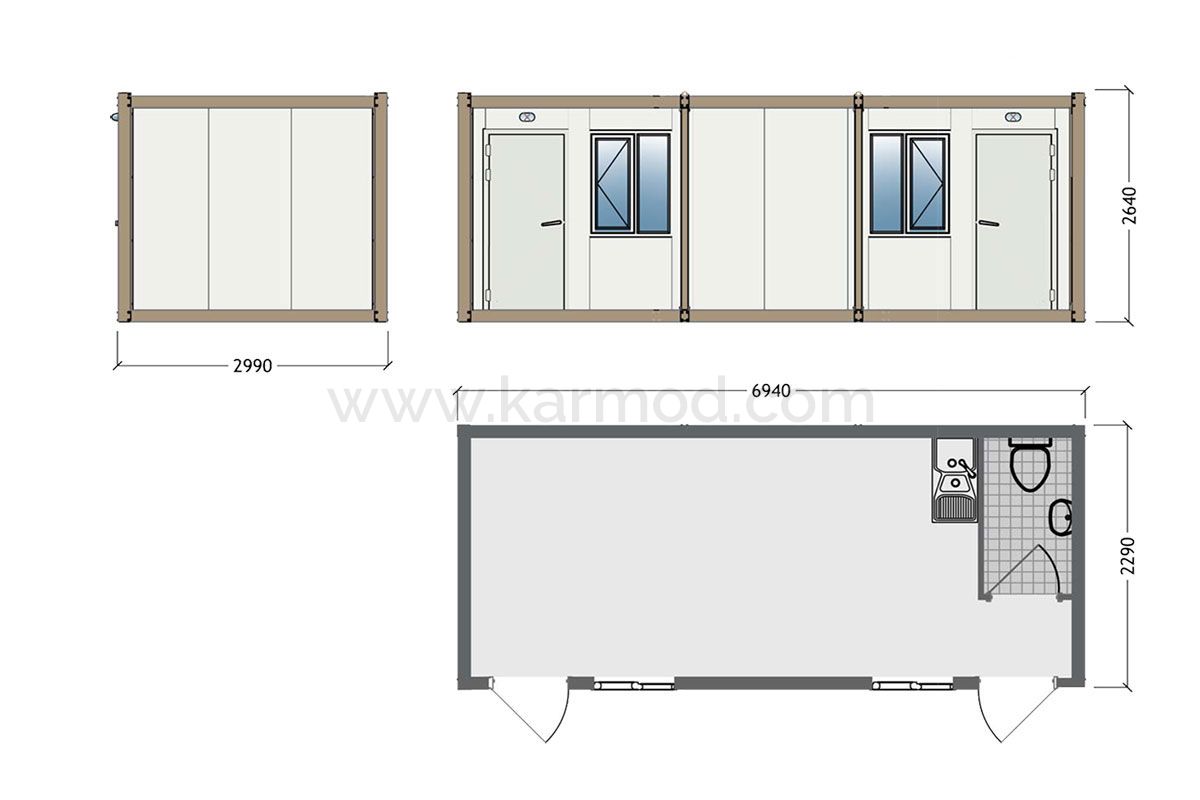 K3004: 2кімн+мийка+туалет, Контейнер 3х7 м