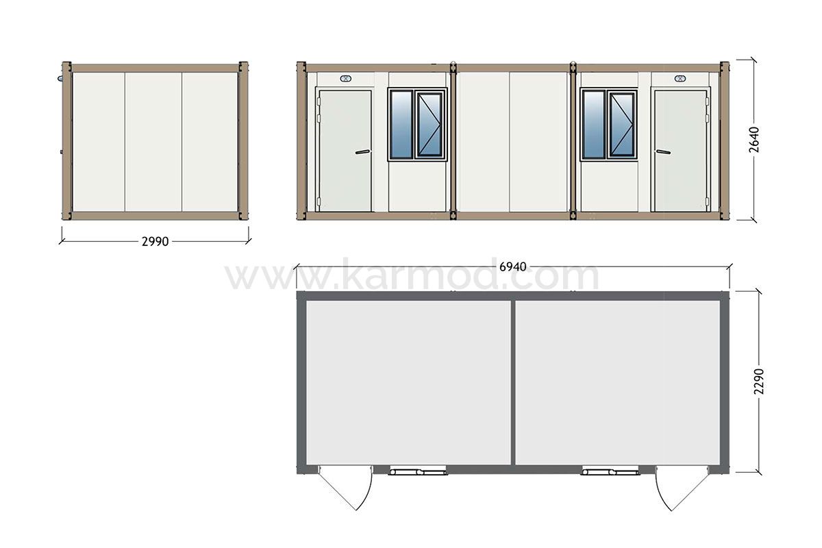 Збірно-розбірний контейнер моделі K 2001, розмірами 3х7 м складається з двох кімнат з двома окремими входами. Завдяки сендвіч панелям, теплоізоляція на вищому рівні. Такий блок-контейнер можна використовувати як битовки будівельні, вагончики для житла будівельників, модульні будівлі контейнерного типу, гуртожитки для робітників та інше. Контейнер можна багаторазово розбирати і збирати, переносити з місця на місце. Ви можете будівельні вагончики купити у заводу виробника побутівок і вагончиків Кармод.