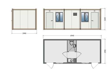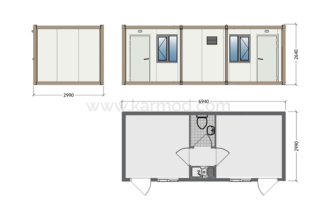 Ця модель K 3003 має розміри 3х7 м і складається з двох кімнат 7,6 м2 з окремими входами. Між кімнатами розташований санвузол і кухонна мийка. Блок контейнер зроблений за панельно каркасною технологією і є збірно розбірним. Має широку сферу застосування: будинки контейнери, будинок вагончики для житла, будівельні вагончики, дачні будиночки битовки. Якщо ви хочете купити житловий вагончик, і вас цікавить ціна, то будь ласка зв'яжіться поштою, вказаною в контактах.