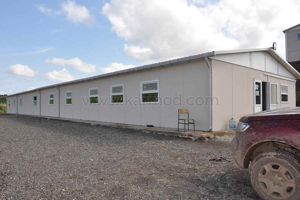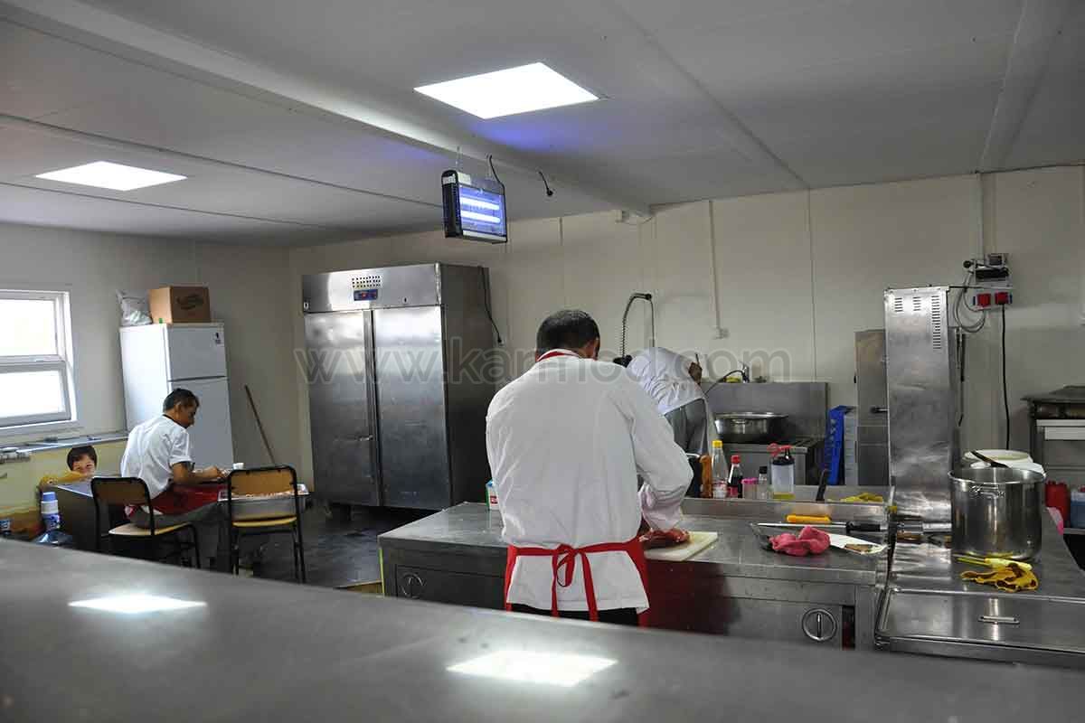 Однією з будівель, виготовлених і встановлених компанією Karmod на будівельному майданчику, є будівля їдальні площею 171 м2. Будівля їдальні розділена на три частини: зал, зона приготування їжі та підвал-склад. У залі, розташованій у передній частині, одночасно можуть приймати їжу 60 осіб. У збірних кафетеріях, які є дуже практичними моделями будівель з погляду прибирання, місткість можна легко збільшити під час планування часових інтервалів.