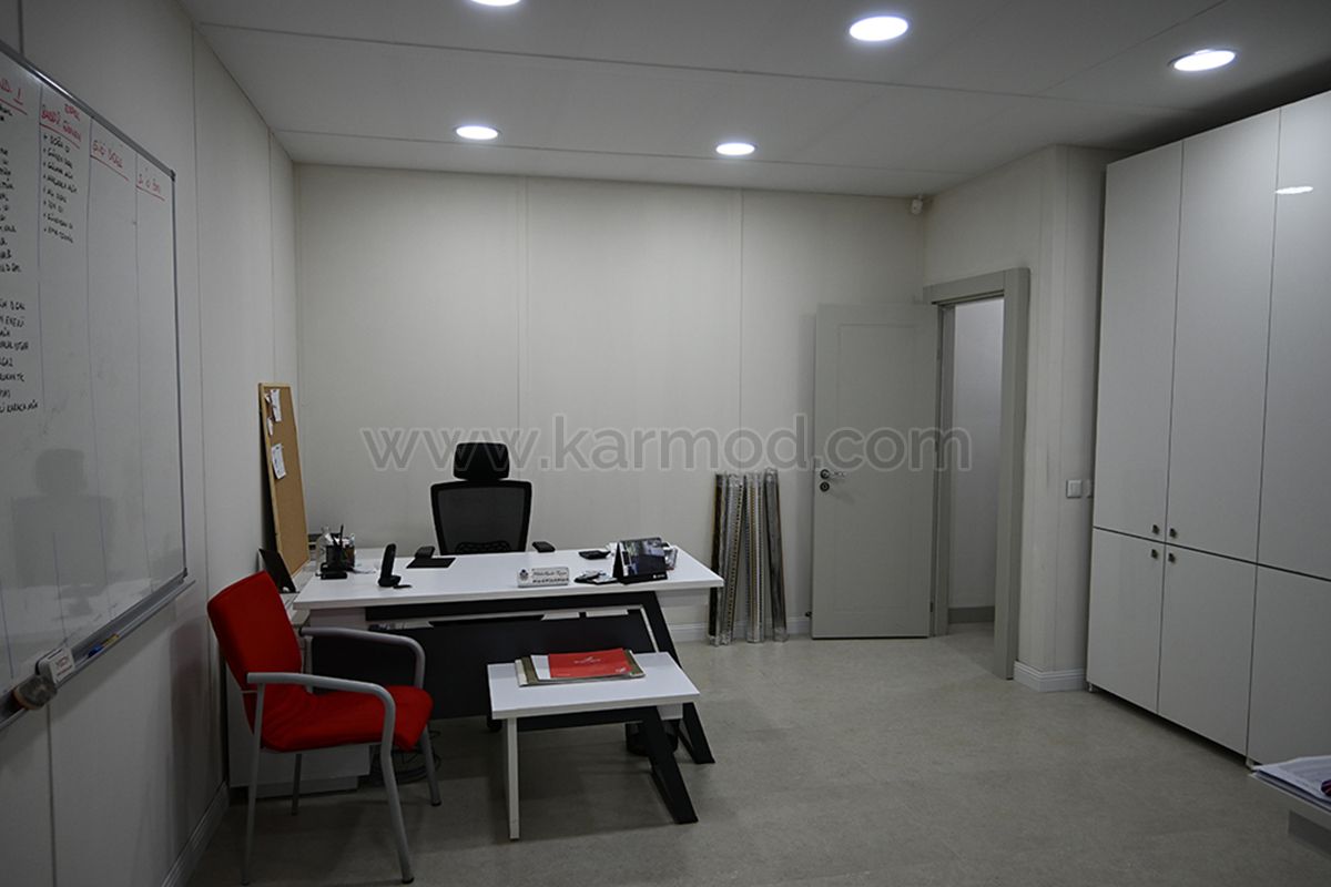 Офісна будівля, спроектована і виготовлена для компанії Numan Kaleli з використанням досвіду Karmod, має площу 245 м2. Ззовні офісна будівля була покрита візерунком з каменю фуга, який відноситься до спеціальних застосувань. Малюнок «фуга» наноситься додатково зовні на стандартні ізольовані стінові панелі. Таке нанесення має дві важливі переваги. По-перше, це естетичний вигляд будівлі ззовні, а по-друге, додаткове посилення теплоізоляції. У збірних будинках з високою теплоізоляцією ізоляція піднімається до ідеального рівня з покриттям фуга. У вікнах офісу керівництва були використані столярні вироби антрацитового кольору, а естетика була інтегрована з вибором сумісної зовнішньої фарби.
