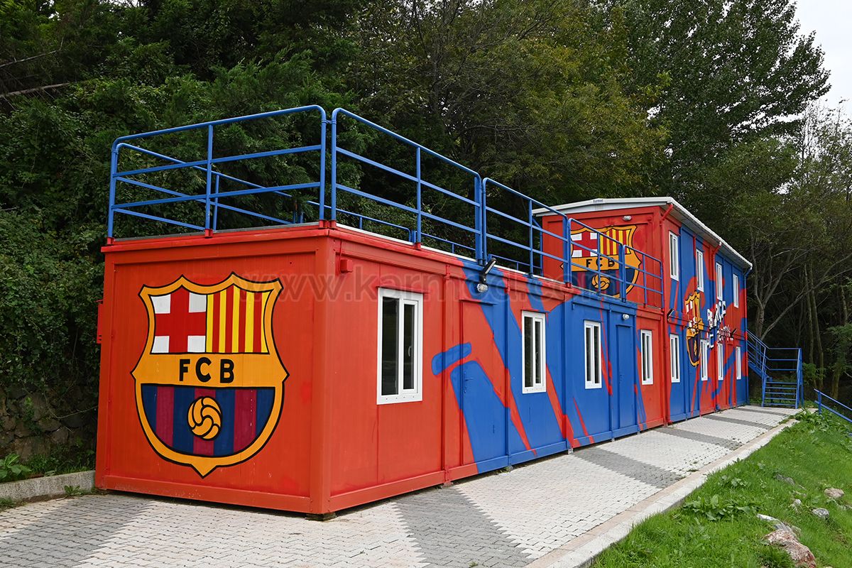 Балконна система також була застосована в проекті будівлі, яка була розташована в позиції, що домінує над полем, де проводилися футбольні тренування. Загалом на двох поверхах у фасадній частині будівлі було облаштовано 4 контейнерні майданчики. Ще два контейнерні блоки були розміщені в одноповерховій комбінації ззаду. Верхні частини двох одноповерхових блоків залишили відкритими та організували у вигляді балконів з перилами. Доступ до цієї секції здійснювався з парадного двоповерхового приміщення. Після завершення монтажу будівля, пофарбована у кольори футбольного клубу "Барселона", була введена в експлуатацію на території Каваджик бази академії.