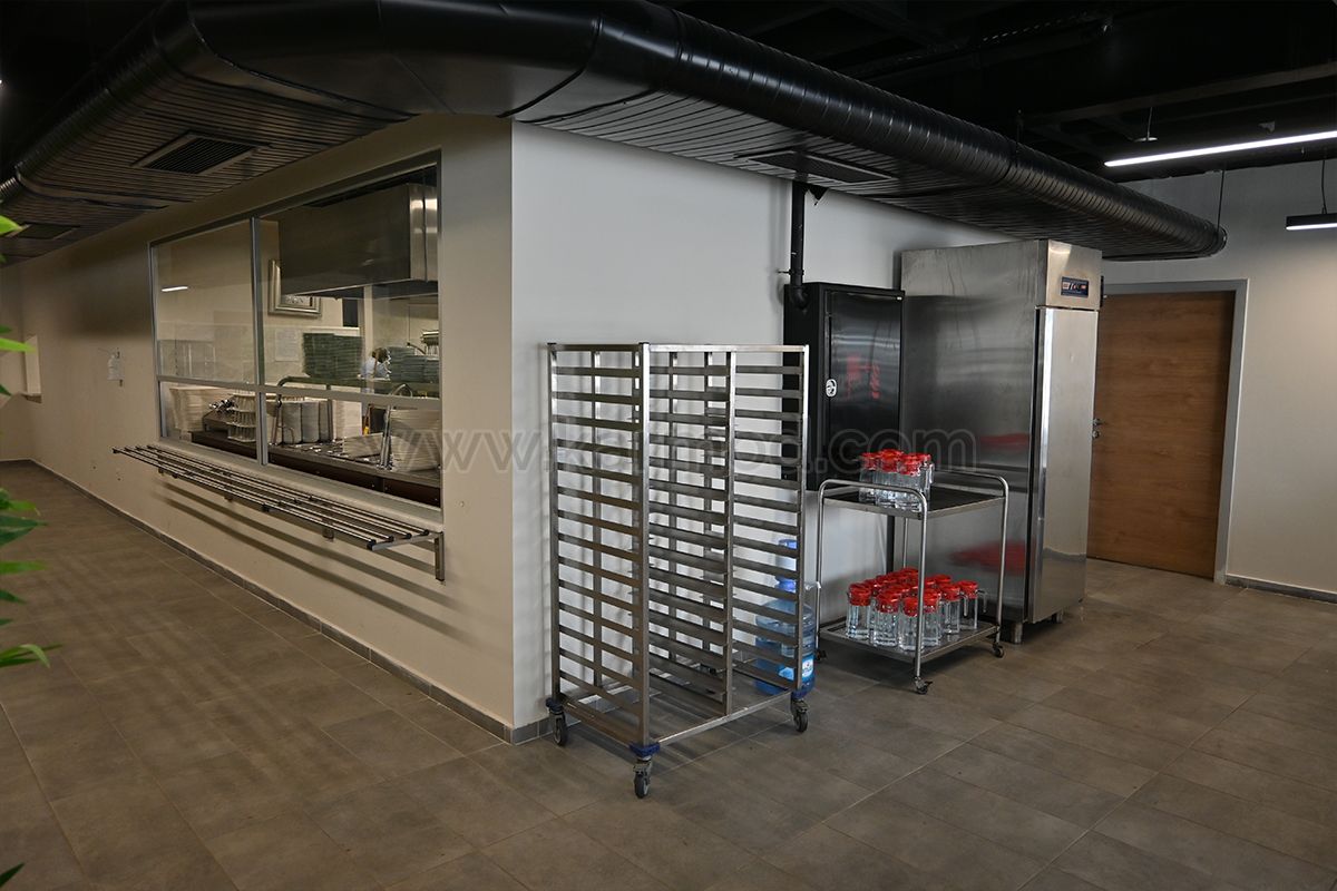 Сталева офісна будівля, спеціально спроектована для корабельні, включає в себе всі зони, необхідні для нагляду за експлуатацією. На першому поверсі є два окремі входи. Увійшовши з головного входу, можна піднятися сходами до робочих кабінетів адміністративного персоналу. Інші двері відведені під їдальню для персоналу. У їдальні є розкішний зал, де одночасно можуть харчуватися 200 осіб, разом з кухонним відділенням. Зал їдальні з видом на сад верфі повністю світлий. Відповідно до напрямку входу, з лівого боку першого поверху будівлі розташовані роздягальні. В одній частині роздягальнь встановлені туалетні та душові кабіни.
