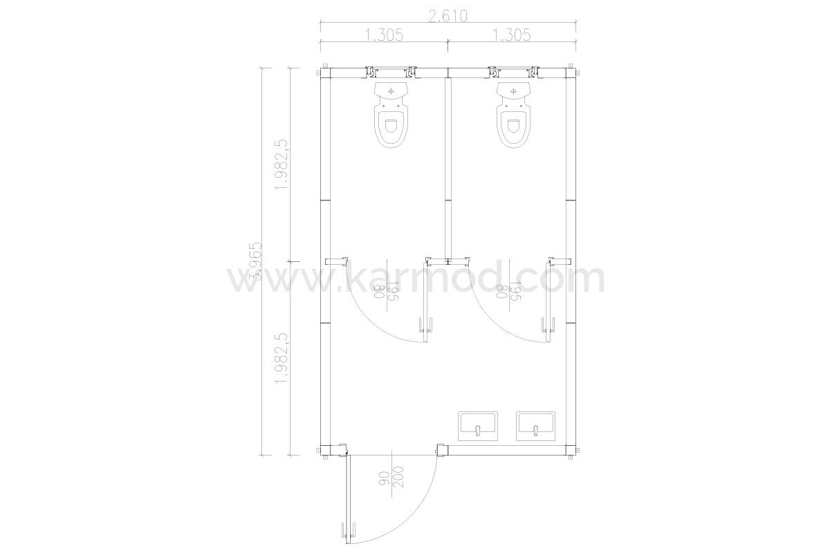 Передфабрикований туалет Кармод з 2 туалетами пропонує практичні рішення для невідкладних потреб з гігієни завдяки швидким процесам виробництва та монтажу. Ці модульні туалети площею 10 м² легко монтуються та готові до негайного використання. Надійна компанія Кармод, яка має референції у 135 країнах, займає лідируюче місце на глобальному ринку. Ці передфабриковані туалети, завдяки своїй стійкості та довговічності використання, є надійним елементом будь-якого зовнішнього проекту, виключаючи потребу в частих замінах або обслуговуванні.